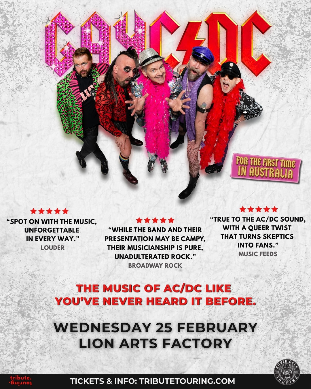 For their first Australian tour, GAYC/DC, rounded out by bassist Glen Pavan, guitarist Topher Ruby, and lead guitarist Steve McKnight (who dedicated 80s/90s hard rock fans may know from Cry Wolf), will bring their explosive live show to six cities across the country this February.